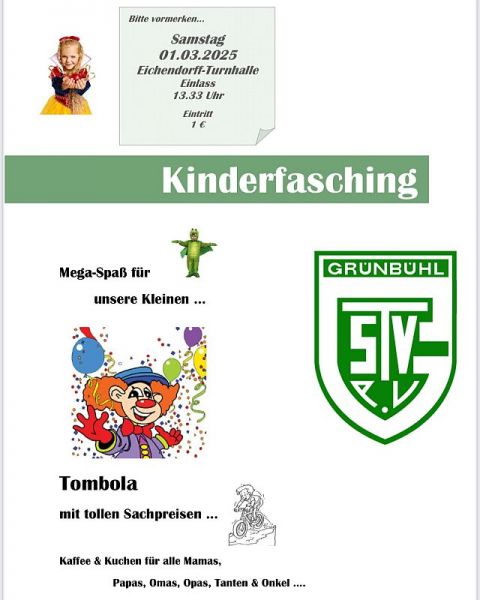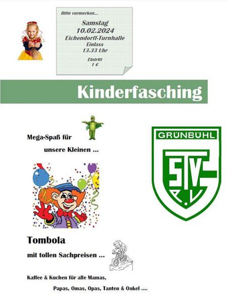 Der Kinderfasching in der Grünbühler Eichendorff-Turnhalle wurde 1982 auf Initiative der Tischtennisabteilung und deren Leiter Anton Schultz erstmals durchgeführt. Er ist aus dem Grünbühler Veranstaltungskalender nicht mehr wegzudenken.