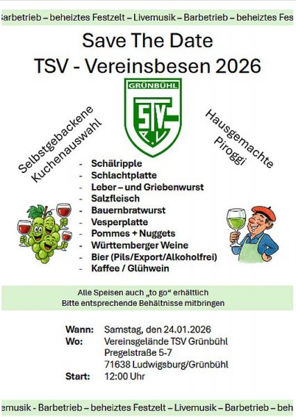 Zum 20.Mal seit 2004 veranstaltete der TSV Grünbühl am 25.01.2025 seinen beliebten Vereinsbesen. Mit beheiztem Festzelt, Barbetrieb, schmackhaften Speisen, Württemberger Weinen u.v.a. war, wie immer, Gemütlichkeit garantiert.