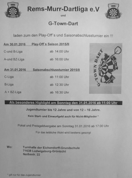 Unsere Darter richten am 30.01.2016 die Playoffs der Rems-Murr Dart Liga der Saison 2015/II aus. Am 31.01.2016 gibt es ein Saisonabschlußturnier, mit einem Jugendturnier als besonderem Bonus. Für letzteres wird kein Start- und Einwurfgeld verlangt.