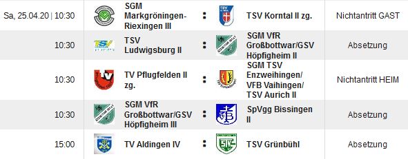 Die Mannschaften von Korntal II und Pflugfelden II wurden zurückgezogen.