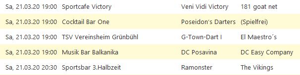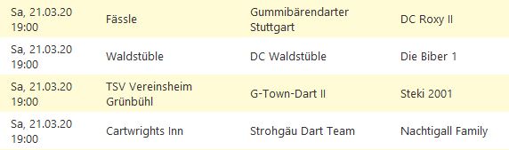 Die Saison 2020-1 wurde von der Dartliga Stuttgart wegen des Corona-Virus komplett abgesagt.