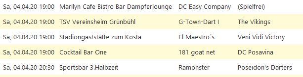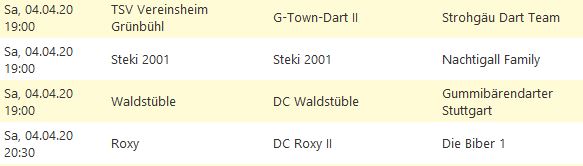 Die Saison 2020-1 wurde von der Dartliga Stuttgart wegen des Corona-Virus komplett abgesagt.