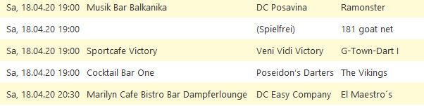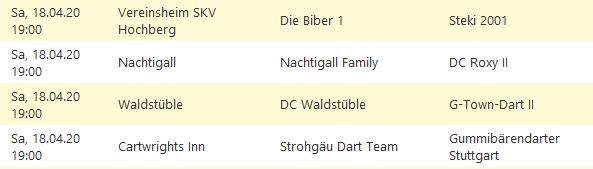 Die Saison 2020-1 wurde von der Dartliga Stuttgart wegen des Corona-Virus komplett abgesagt.