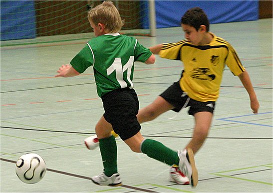 Das Finale war ein echtes Stadtduell: TSV Grünbühl gegen FSV Oßweil. Es war kaum angepfiffen, da gelang Philipp, der zuerst am Torwart scheiterte, aus spitzem Winkel das 1:0. Kurz darauf startete Noel ein Solo durch fast die ganze Halle, scheiterte aber am herausgeeilten Torwart. Dann zog Florent ab, aber der Torhüter lenkte mit guter Parade zur Ecke. Später trudelte der Ball die Torlinie entlang, aber kein Grünbühler Bein konnte die Kugel über die Linie schubsen. Die Oßweiler drängten jetzt auf den Ausgleich. Als dann drei Minuten vor Schluß gleich drei Grünbühler am Torwart scheiterten, war das Zittern leider noch nicht beendet. Aber dann erlöste Florent zwei Minuten vor Ende mit dem 2:0 alle Grünbühler. Oßweil gab jetzt mehr oder weniger auf, und kurz vor dem Abpfiff sorgte Jason mit dem 3:0 für den Endstand.